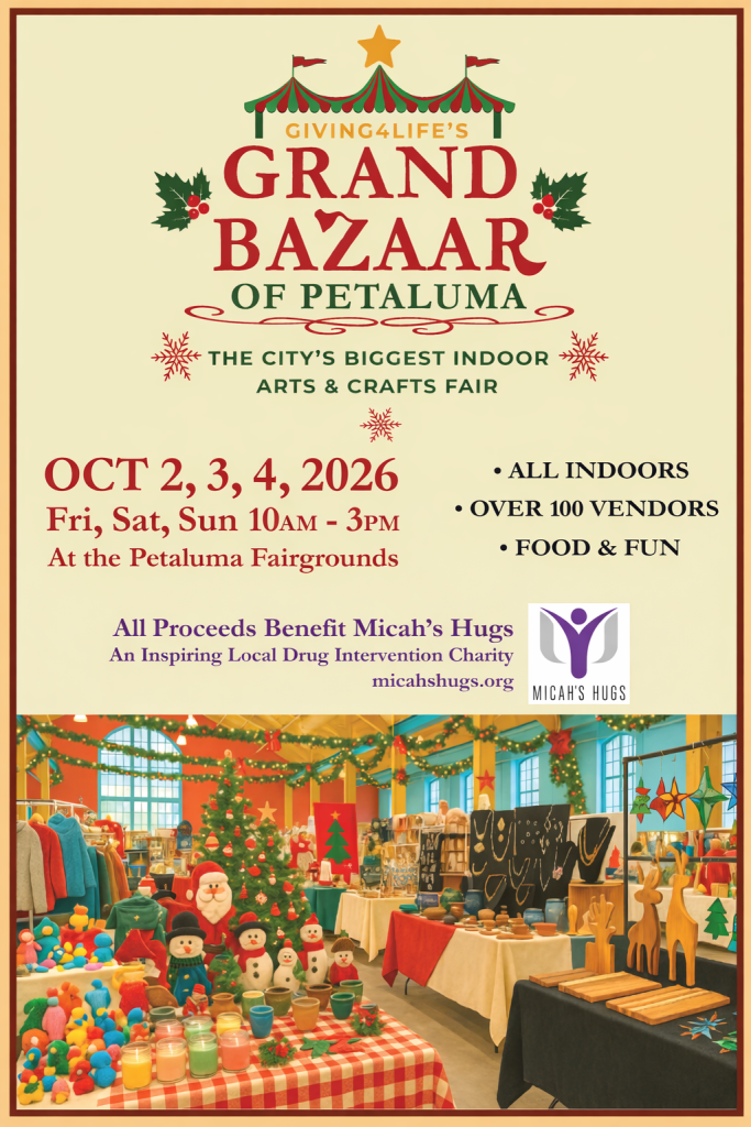 Thank you all for attending the 2025 Grand Bazaar of Petaluma. It was a HUGE success!. We raised over $20, 000 for Micah’s Hugs, an inspiring local drug intervention charity.